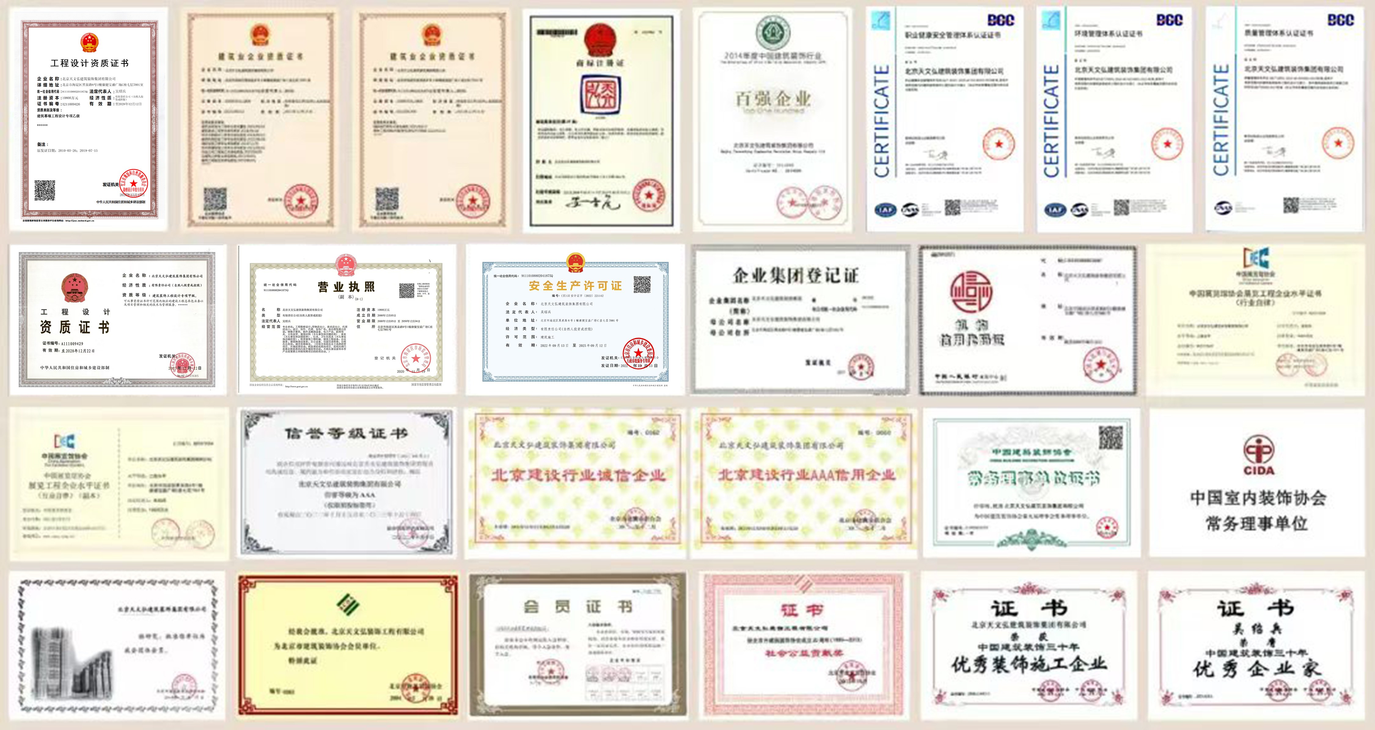 北京天文弘建筑裝飾集團(tuán)有限公司,始創(chuàng)于1995年,正式成立于2000年,注冊(cè)資本10800萬(wàn)元??偛课挥诒本┦泻5韰^(qū)寶盛廣場(chǎng)。是建設(shè)部核準(zhǔn)的國(guó)家建筑裝飾設(shè)計(jì)甲級(jí)資質(zhì)、 施工壹級(jí)資質(zhì)的企業(yè);同時(shí)具有建筑工程施工總承包貳級(jí)、市政公用工程施工總承包貳級(jí)、建筑幕墻工程設(shè)計(jì)乙級(jí)、施工貳級(jí)、電子與智能化工程專業(yè)承包貳級(jí)、建筑機(jī)電安裝工程專 業(yè)承包貳級(jí)、消防設(shè)施工程專業(yè)承包貳級(jí)、防水防腐保溫工程專業(yè)承包貳級(jí)、古建筑工程專 業(yè)承包貳級(jí)、展覽陳列工程設(shè)計(jì)與施工一體化資質(zhì)壹級(jí)、特種工程及鋼結(jié)構(gòu)等多項(xiàng)資質(zhì)。連 續(xù)多年通過(guò)了ISO9001質(zhì)量管理體系、ISO14001 環(huán)境管理體系、ISO28001職業(yè)健康安全管理體系認(rèn)證。現(xiàn)為阿里巴巴經(jīng)濟(jì)體優(yōu)秀供應(yīng)商、融創(chuàng)·中國(guó)戰(zhàn)略合作伙伴、中國(guó)建筑裝飾協(xié)會(huì)常務(wù)理事單位、北京市建筑裝飾協(xié)會(huì)副會(huì)長(zhǎng)單位、中國(guó)建筑裝飾行業(yè)百?gòu)?qiáng)企業(yè)。是中央國(guó)家機(jī)關(guān)2011-2025年度工程項(xiàng)目定點(diǎn)施工企業(yè)。