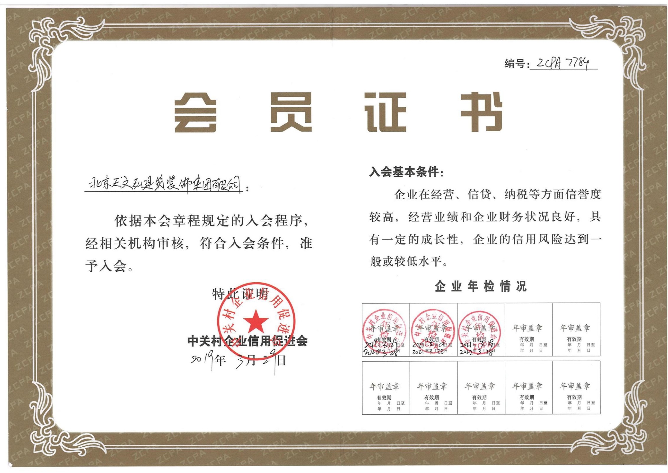 中關(guān)村企業(yè)信用促進(jìn)會(huì)會(huì)員證書(shū)