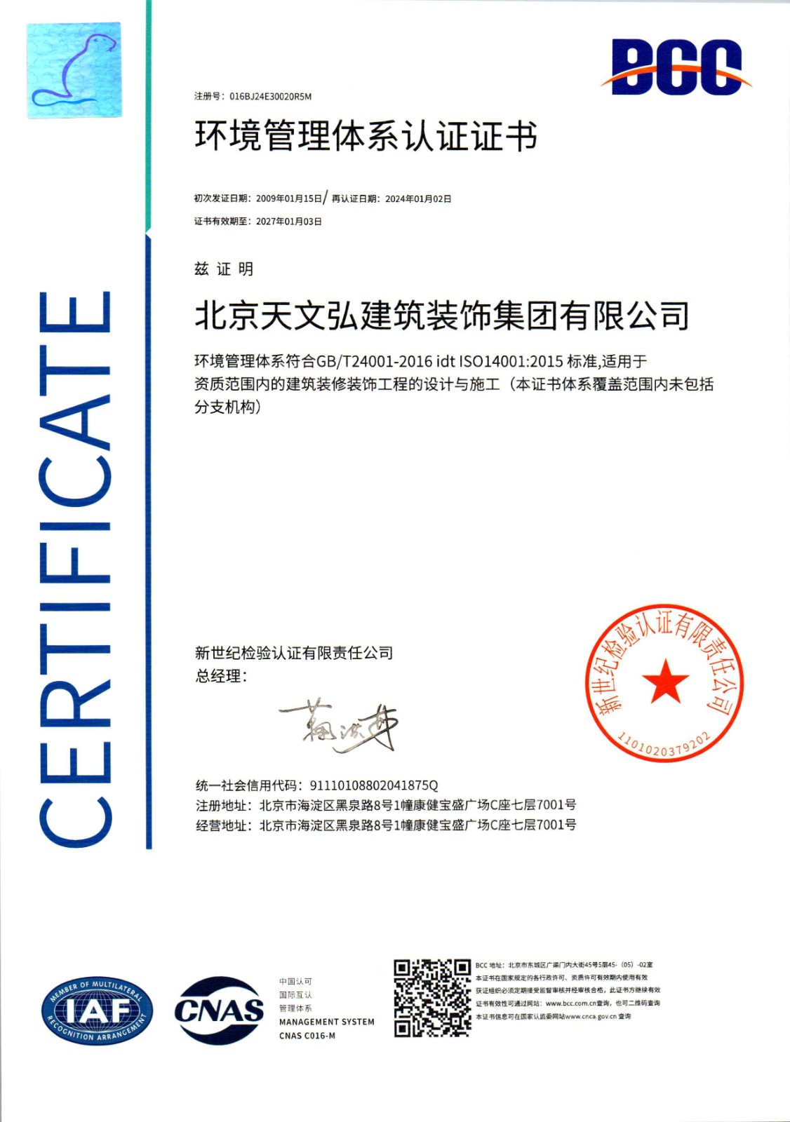 環(huán)境管理體系認(rèn)證證書